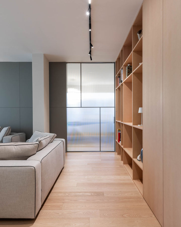 Un attico luminoso dal carattere sobrio ed elegante, dove materiali naturali e tonalità neutre definiscono un equilibrio raffinato tra comfort e contemporaneità. Il progetto articola gli spazi attraverso quinte architettoniche e arredi su misura in legno chiaro, che dialogano con superfici in grigio opaco e dettagli in pietra. L’illuminazione integrata e la cura delle proporzioni restituiscono un’atmosfera domestica di calma e precisione.